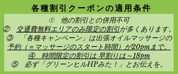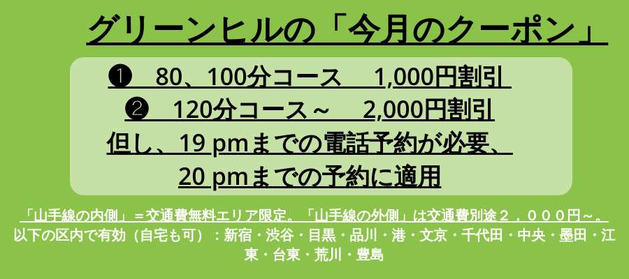 当店、グリーンヒルが提供する出張オイル・オイルリンパマッサージの「割引クーポン」のご案内です。