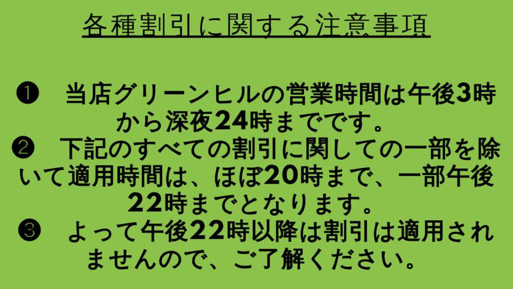 - 適用条件⓵:「グリーンヒルHP見た」と、利用する「割引クーポン」名を申告ください。・・・当店は多数の「割引クーポン」を御用意しているのでお客様の利用する時間帯・環境によってそれを選択してもらう必要がりますので。